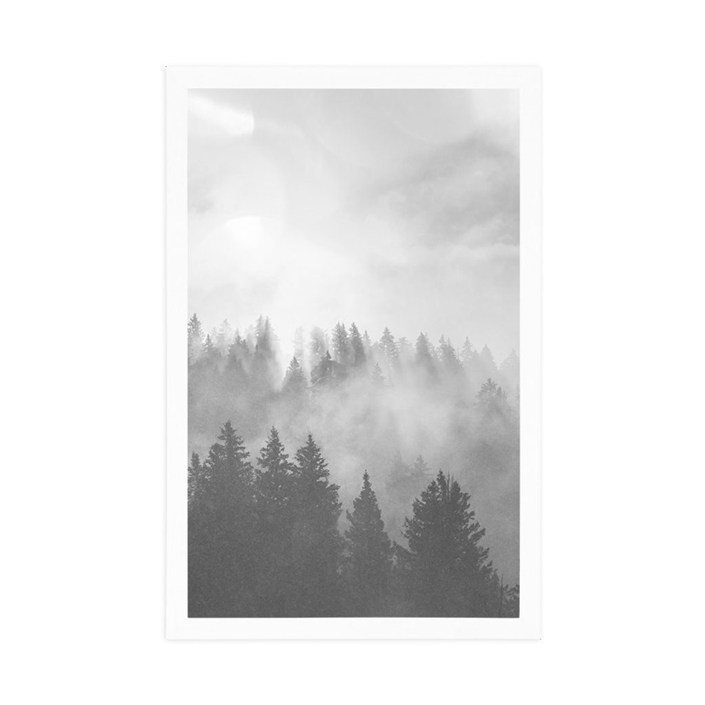 AFFICHE AVEC PASSE-PARTOUT – BROUILLARD SUR LA FORÊT EN NOIR ET BLANC - NOIR ET BLANC - AFFICHES