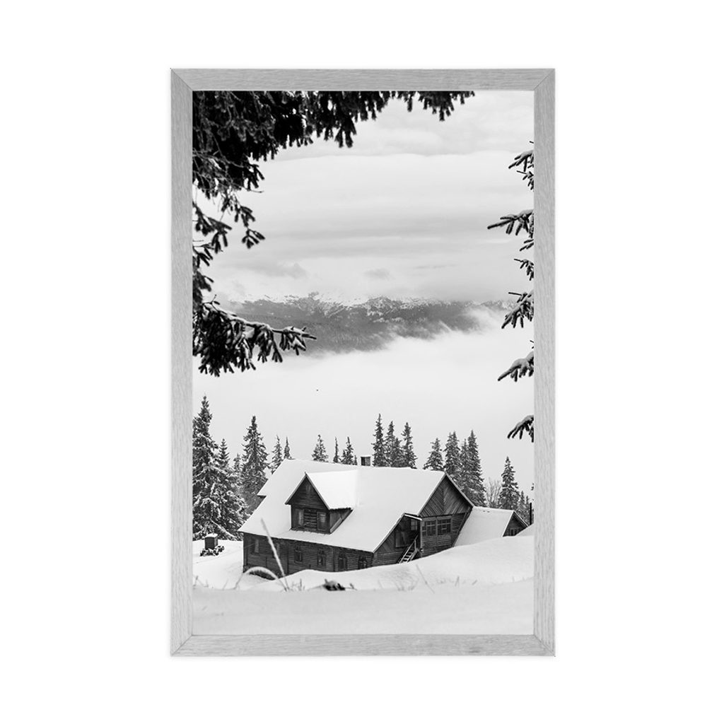 Affiche – Petite maison en bois près des pins enneigés en noir et blanc