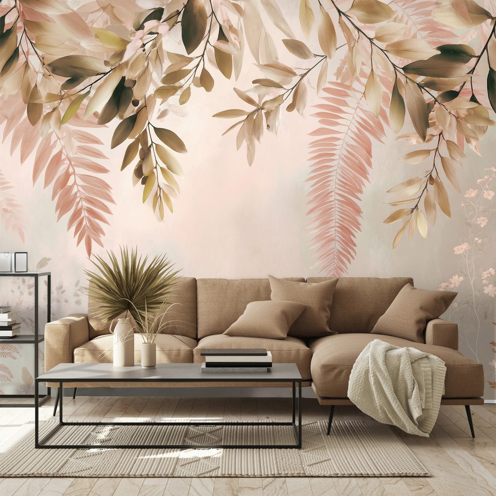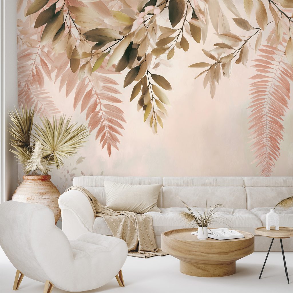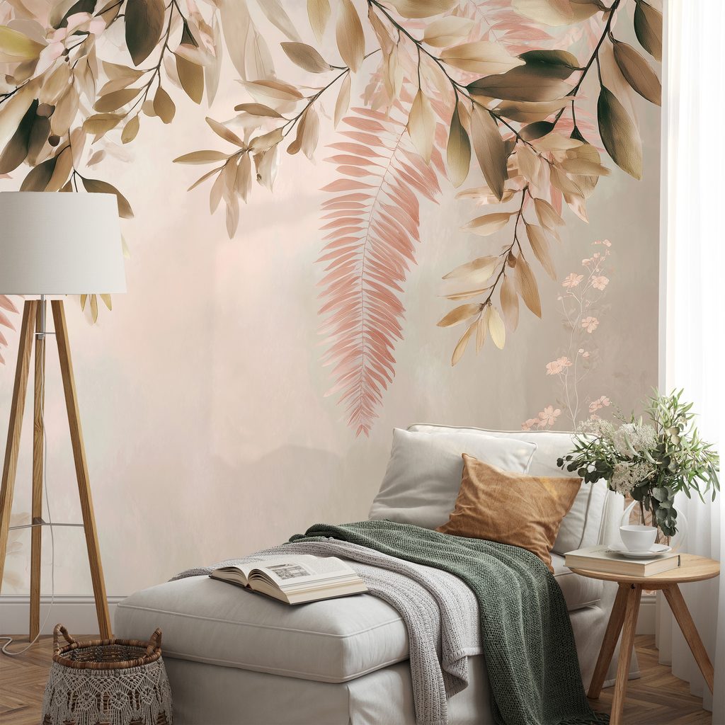 Papier peint autocollant – Feuilles roses et beiges délicates