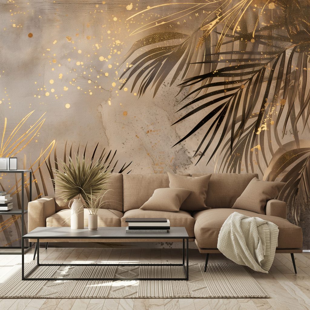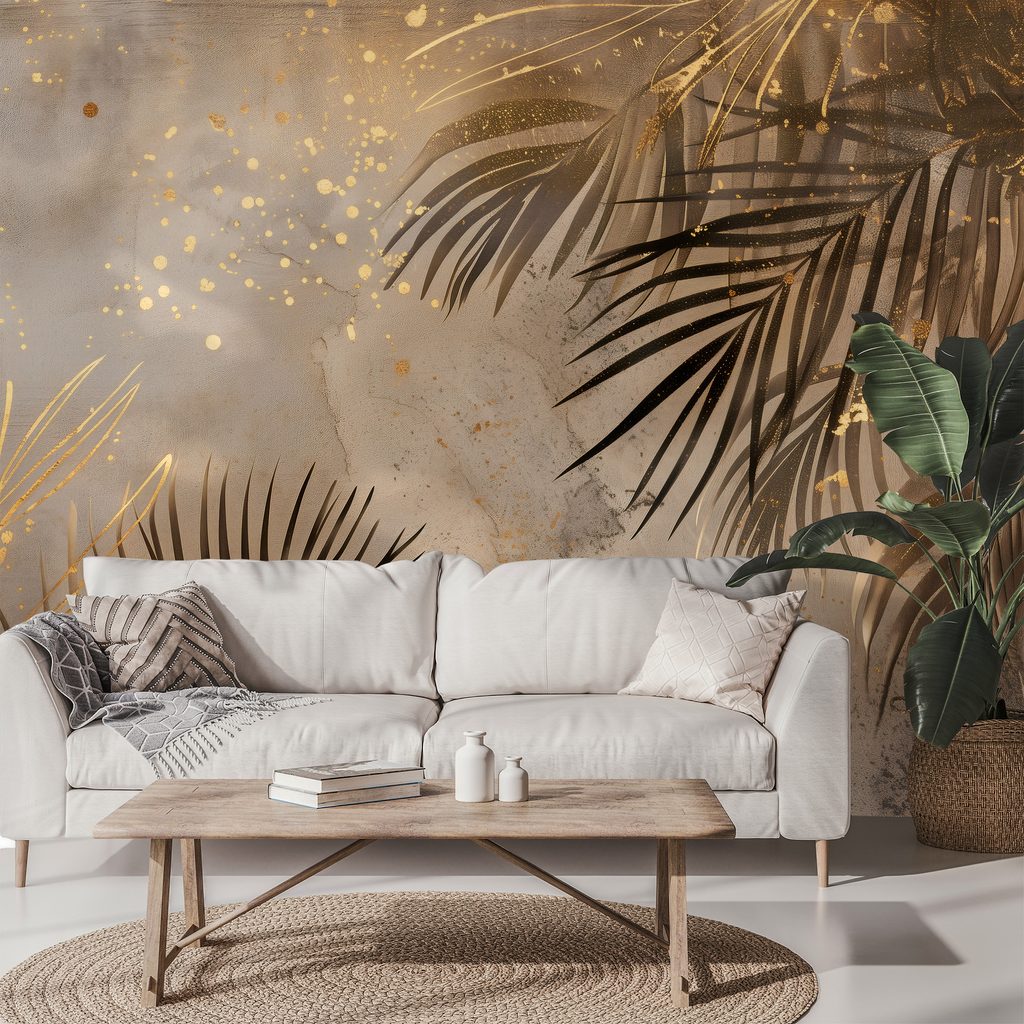 Papier peint panoramique adhésif – Feuilles de palmier dorées sur gris