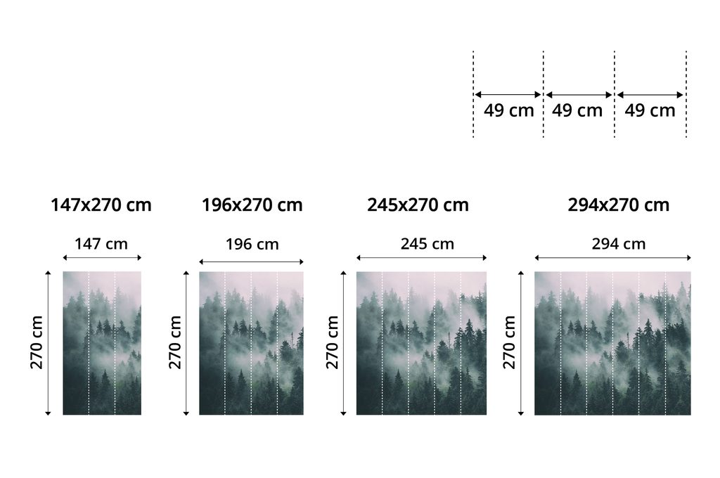 Pour les papiers peints d’une hauteur de 270 cm, le motif est ajusté à la taille sélectionnée, ce qui peut entraîner une perte partielle du visuel. En cliquant sur une dimension sur le site, vous verrez l’aspect exact du papier peint. Les tailles se composent de bandes de 49 cm de large.